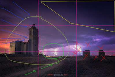 Apreciamos en el gráfico como el camino nos conduce hacia los rayos de la izquierda, ampliando el círculo hacia la forma reconocible de la iglesia, que a su vez tiene la torre lamiendo su tercio correspondiente, otorgando fuerza a esa parte de la imagen. La cálida luz de la contaminación lumínica tras la iglesia también suma, y la dirección de las nubes (efecto del gran angular) nos dirige hacia el círculo de interés que se ha creado en la parte izquierda de la escena. Para terminar, la zona vacía de cielo, superior derecha, cierra la imagen empujando la vista hacia abajo.